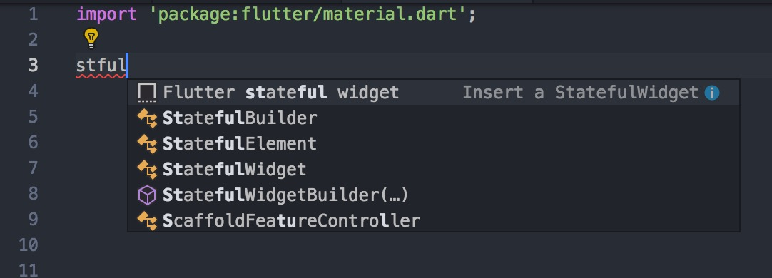 笔者用的是 vs code,然后有安装 flutter 、dart 的插件。要实现上述的结构,只要在编辑器中输入 stful,然后就会有提示出来了,如图所示: