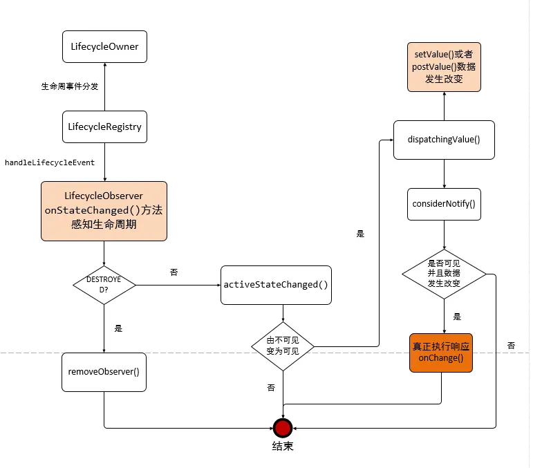 基于这套原理,只要LiveData注册了对Activity/Fragment的生命周期监听,也就拥有了感知生命周期的能力。