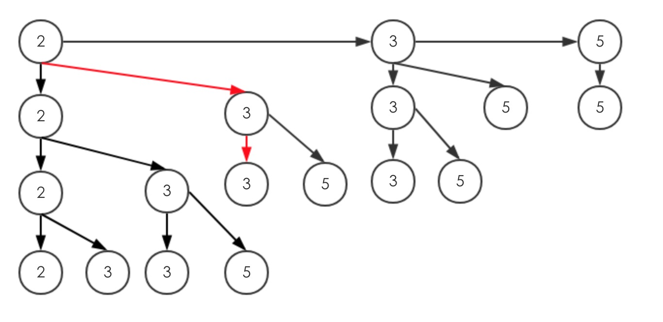 假设输入数据为 candidates = [2,3,5], target = 8。可以做如下初步分析: