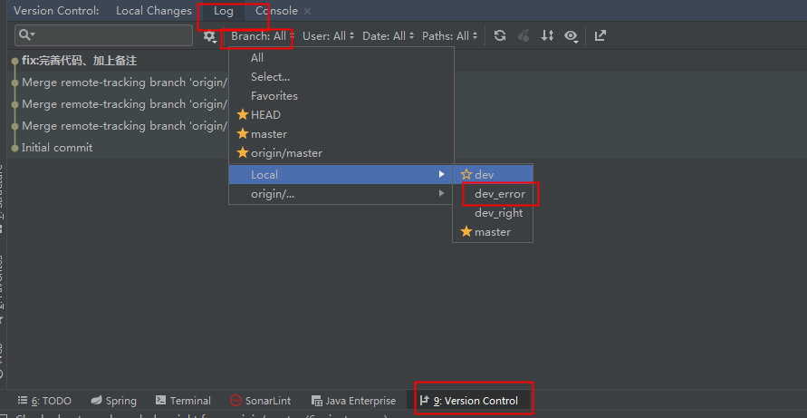 version Control -> log -> Branch ->选择错误分支(示例选择的是本地的dev_error分支、所以位置在local/dev_error)