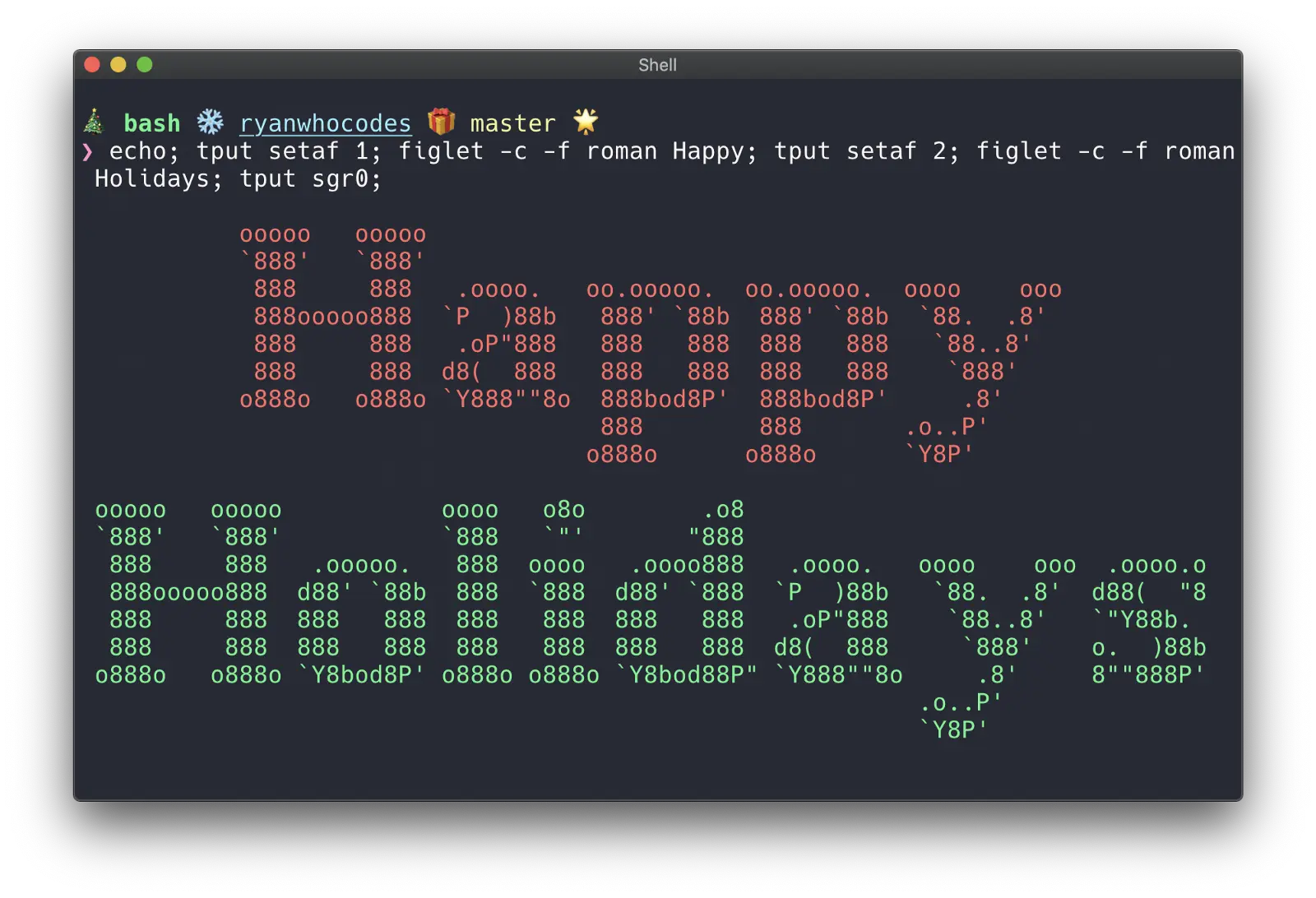 echo; tput setaf 1; figlet -c -f roman Happy; tput setaf 2; figlet -c -f roman Holidays; tput sgr0;