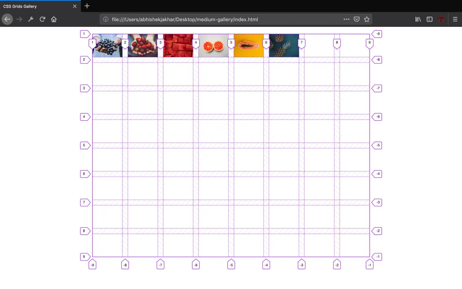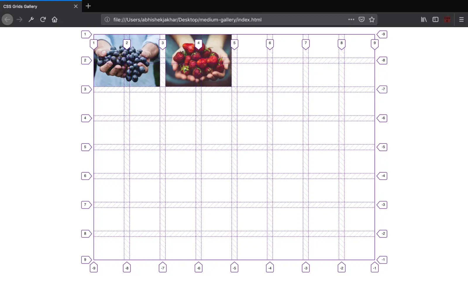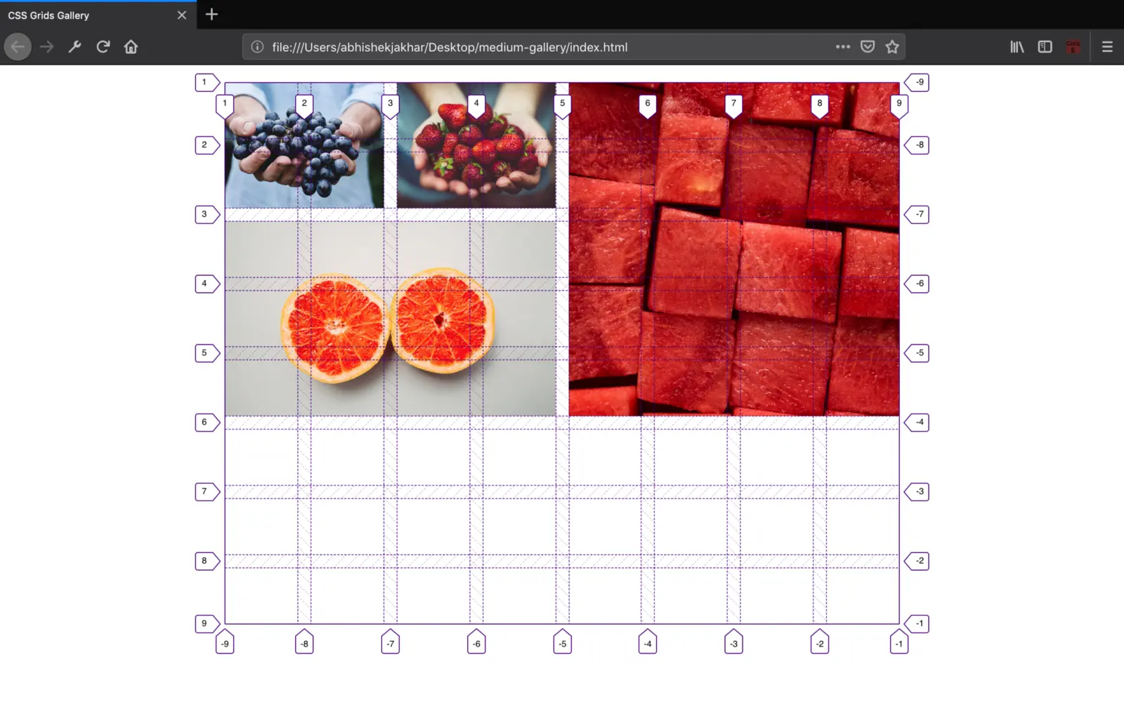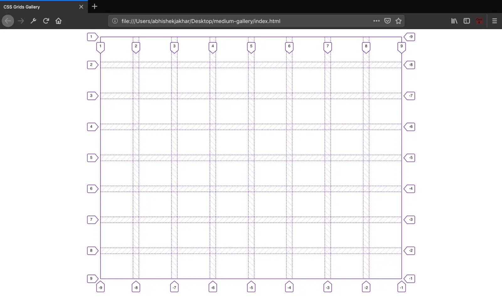 The vertical lines 1 and 2 determine the start and end points of the first column. Lines 2 and 3 the second column and so on. Similarly, horizontal lines 1 and 2 determine the position of the first row, and lines 2 and 3 the second row and so on. Knowing the above concepts will help you understand how we are going to position items (images) on our grid.