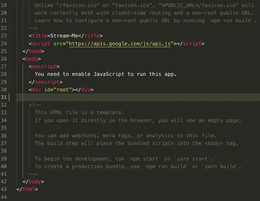 Modals can be a tricky topic in React because of the way React structures the DOM. If you’re familiar with the basics of React, you will know that the entire App is a component, usually called <App /> that gets gets appended as a child to a <div> called #root. The index.html file looks like this:
