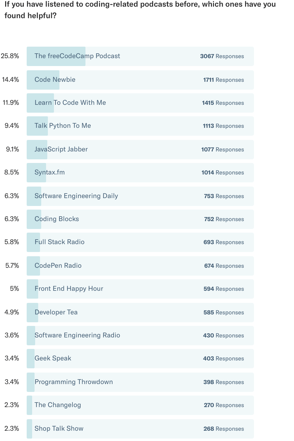 Most new coders haven’t yet started listening to podcasts, but the ones who do listen to a wide range of them.