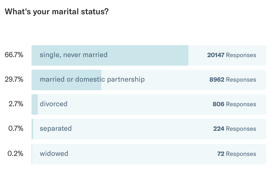 About 1/3 of respondents take care of dependents. 16% have children and 8% are taking care of elderly relatives or relatives with disabilities.