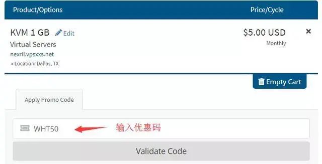 如图所示输入Nexril优惠码WHT50,点击下面的Validate Code就是优惠后的价格了,然后点击右侧蓝色按钮下一步: