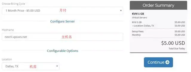 首先选择服务器配置,记得最多选一个月或者季付,不然没法用优惠码,然后主机名随便写,只要是网址就可以,只有一个达拉斯机房没得选,然后点击右侧蓝色按钮下一步: