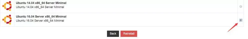 然后选择要安装的系统,主流的linux操作系统都有的,VPS小学生这里只是为了截图方便,实际上VPS小学生是用的最上面的centos7 mini系统。选择好要安装的系统后点击Reinstall,会弹出对话框问是否安装,选择yes就可以了,大约10分钟左右系统就装好了,在页面就可以看到服务器密码了。