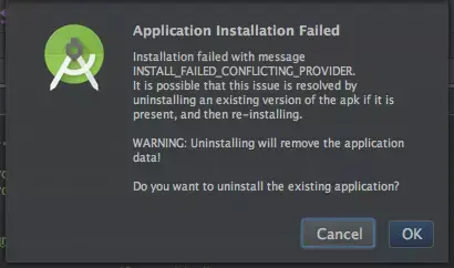 这样导致的后果就是导调用相机的时候闪退,并且每次通过IDE安装应用的时候都会弹出下面的提示要重新安装App: