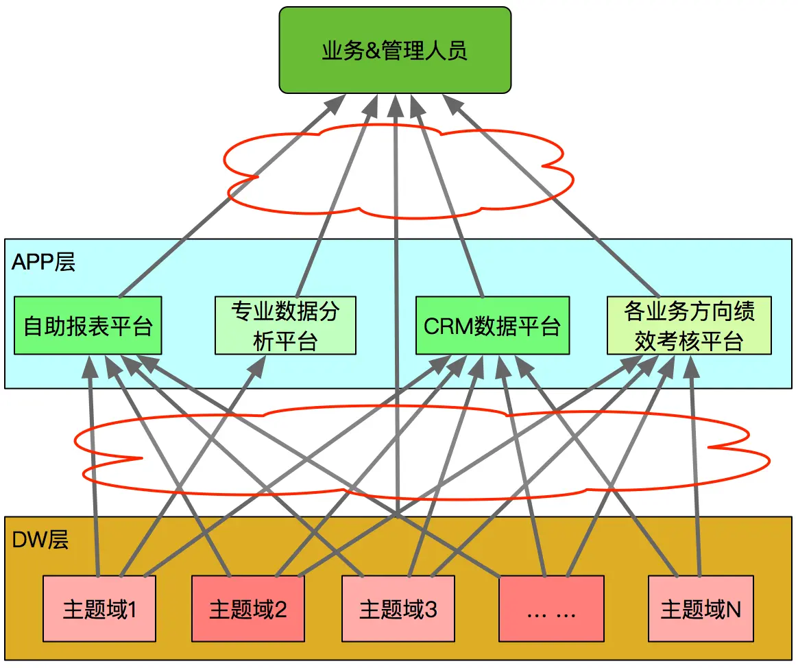 作为一家高度数字化和技术驱动的公司,美团非常重视数据价值的挖掘。在公司日常运行中,通过各种数据分析挖掘手段,为公司发展决策和业务开展提供数据支持。经过多年的发展,美团酒旅内部形成了一套完整的解决方案,核心由数据仓库+各种数据平台的方式实现。其中数据仓库整合各业务线的数据,消灭数据孤岛;各种数据平台拥有不同的特色和定位,例如:自助报表平台、专业数据分析平台、CRM数据平台、各业务方向绩效考核平台等,满足各类数据分析挖掘需求。早期数据仓库与各种数据平台的体系架构如图1所示: