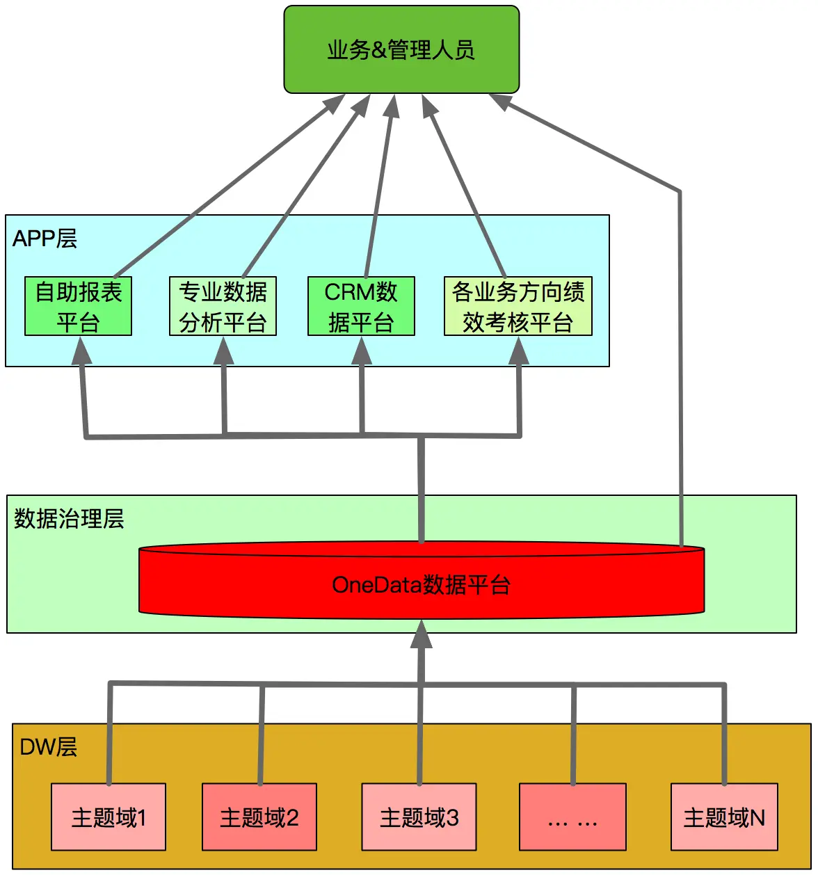为了达成数据治理的目标,起源数据治理平台就必须记录下业务发展过程,并映射到数据加工和数据提取,规范约束这些过程。因此起源数据治理平台归纳到数据治理层,该层就位于数据仓库层(或数据集市层)之上,数据应用层之下起到桥梁的作用,而且提供一系列规则,改变原来无序交互方式,将数据仓库层和数据应用层的交互变为有序的、可查询、可监控。新的体系架构如图2所示: