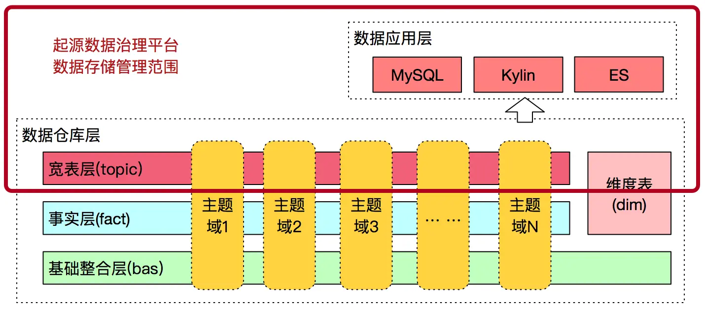 起源数据治理平台管理的数据存储范围包括:数据仓库中的Topic层和数据应用层,存储方式包括:Hive、MySQL、Kylin、Palo、ES、Druid。如下图4所示: