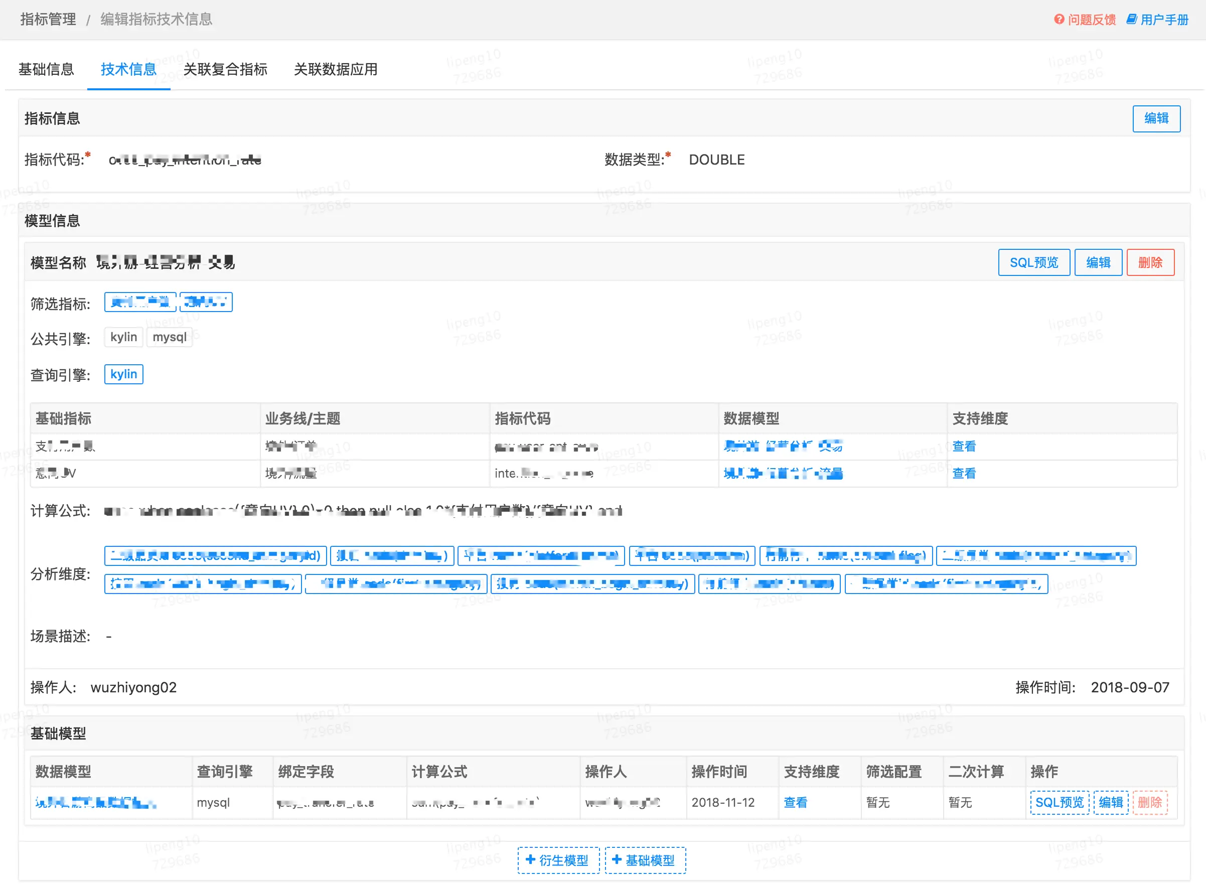 衍生信息中的关联指标、关联应用管理,是为了方便观察指标被那些其他指标和数据应用使用,这是因为指标技术信息采用了严格权限控制,一旦被使用为了保证线上的运行安全是禁止变更的,只有解绑并审核通过后才可以编辑,所以这些衍生信息就是方便管理人员使用。指标技术信息如图7所示: