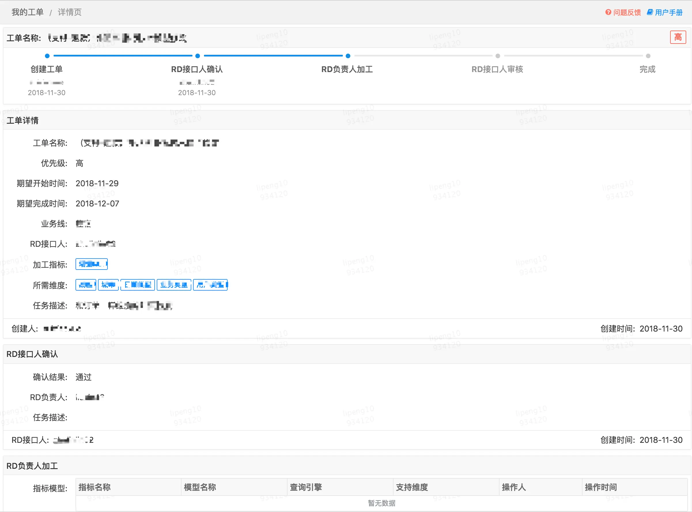 工单模块管理实现了指标维度和对应模型加工线上申请、审核、加工、审批的流程。整个模块也是围绕着这四个流程实现的,具体是业务人员发起指标和维度集合的加工申请,然后由数据线接口人审核工单的合理性并分配对应的数据开发工程师,数据开发工程师加工模型并与对应的维度指标绑定,然后在工单中提交由数据接口人审核是否合理,最终由工单发起人验收。