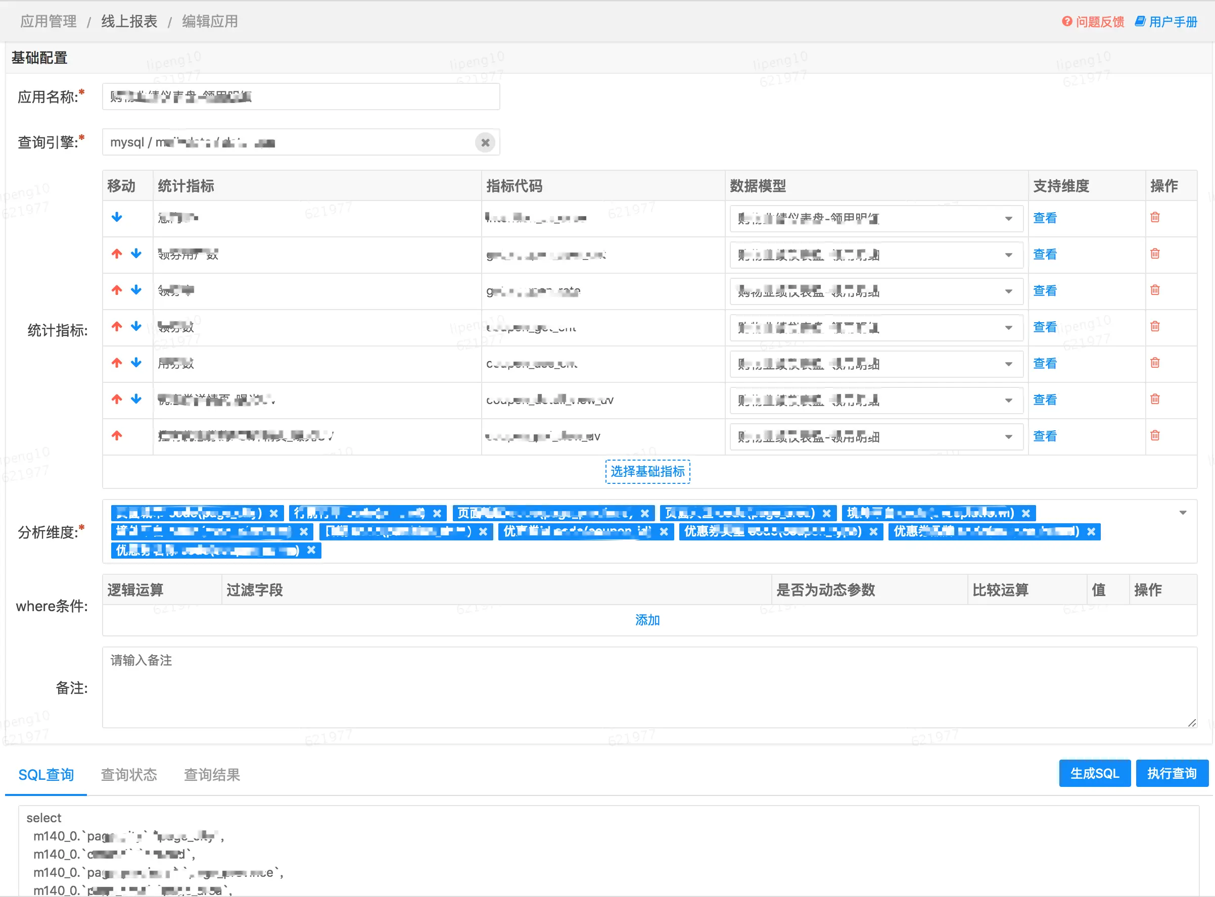 数据应用模块是记录生成每个服务所需的指标、维度和数据模型的关系。每次服务中可以包含多个指标,这些指标可以来源于多个数据模型,不过不同的数据模型中需要包含公共维度,因为是通过这些公共维度将不同模型关联起来。