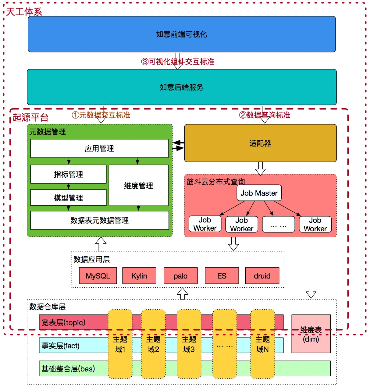 起源数据治理平台是天工体系(从数据管理、查询到展示的一个完整生态)的一部分,整个天工体系还包括如意通用报表系统、筋斗云数据查询系统。通过对天工体系的建设,直接目标是为业务提供一整套高效、高质量的数据服务平台;但是在天工体系的建设中,进行微服务治理,抽象形出一套统一标准,吸纳更多的业务参与建设,为业务提供开发降级,避免服务的重复建设,提升服务建设速度。如下图13所示: