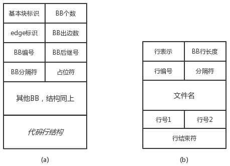 通过这四部分结构可以完全还原插桩代码和源码的关联,我们以 BB 结构 / BB 行结构为例,给出结构图 2 (a) BB 结构,(b) BB 行信息结构,在本章末尾覆盖率解析部分,我们利用这个结构图还原代码执行次数(每行等高格代表 64bit):