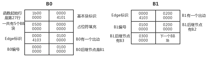 例 1 中基本块 B0,B1 对应的 .gcno 文件结构如下图所示,从图中可以看出,BB 的主结构完全记录了基本块之间的跳转关系。