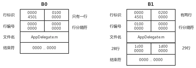 B0,B1 的行信息在 .gcno 中表示如下图所示,B0 块因为是入口块,只有一行,对应行号可以从 B1 结构中获取,而 B1 有两行代码,会依次把行号写入 .gcno 文件。