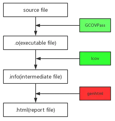 比 gcov 直接生成报告多了一步,lcov 的处理流程是将 .gcno 和 .gcda 文件解析成一个以 .info 结尾的中间文件(这个文件已经包含全部覆盖率信息了),之后通过覆盖率报告生成工具生成可读性比较好的 HTML 报告。