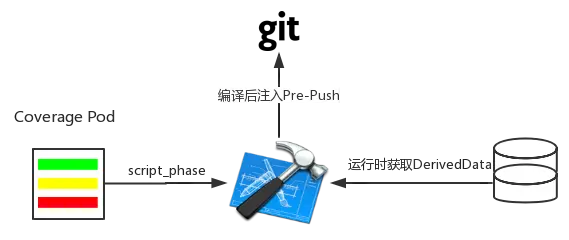 我们考虑到 Pod 本身会被纳入版本控制,因此利用了 CocoaPods 的一个属性 script_phase,增加了 Pod 编译后脚本,来帮助我们把 pre-push 插入到本地仓库。利用 script_phase 插入还带来了另外一个好处,我们可以直接获取到工程的缓存文件,也避免了 .gcno / .gcda 文件获取的不确定性。整个流程如下: