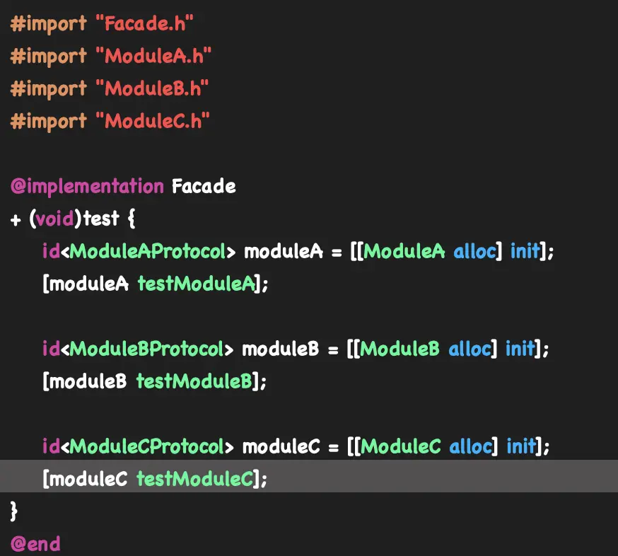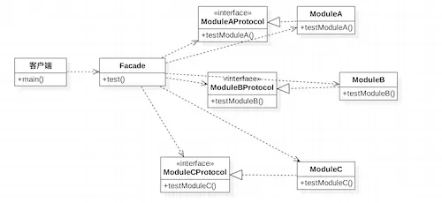 案例:有ModuleA,ModuleB,ModuleC三个类,这三个类实现三个不同的方法 1.按照普通思路,客户端如果想要和这三个类打交道,一般的做法就是直接引入三个类,分别进行实例化,然后引用三个类中的方法 2.采用外观模式,客户端无需知道这三个类的存在,只需要和外观层进行交互即可