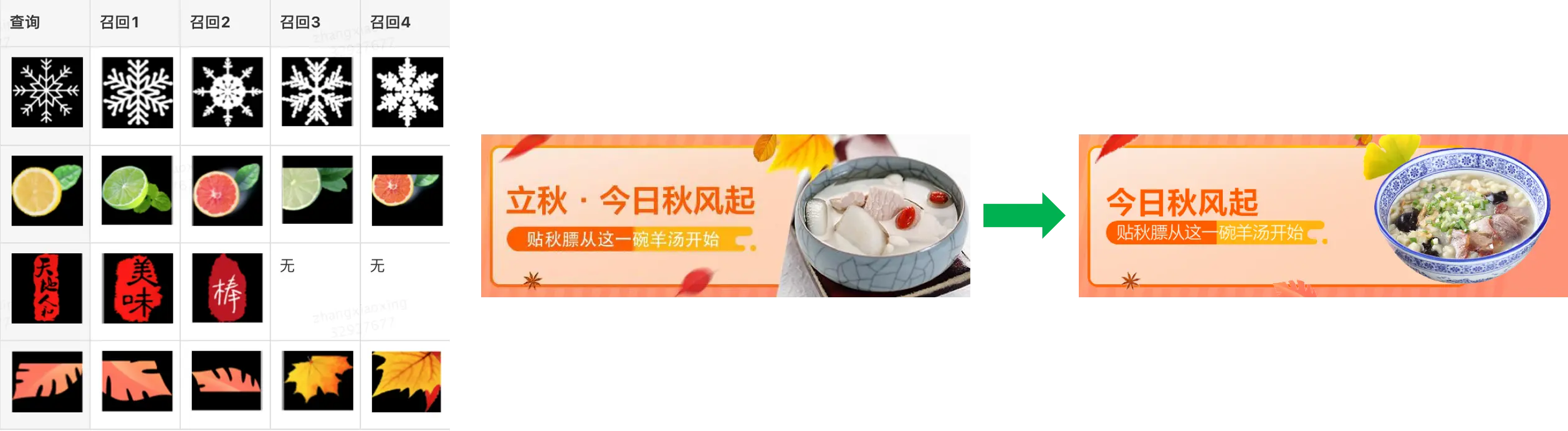 上述的常规设计风格的学习属于一种广义的设计风格,需要设计师先期投入很多精力做风格划分以及数据收集、处理。为了快速适配热点场景,我们借鉴图像检索技术(如图10所示),提取素材图片的CNN特征及颜色特征,使用欧式距离来度量素材相似度,这能节省人工打标签的成本,实现基于固定模板的自动拓展及生成(海报临摹)。