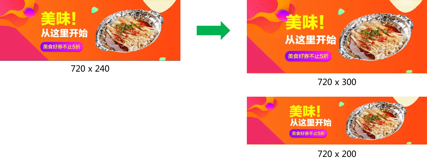 在日常工作中,设计师在设计出Banner后,往往要花费很长时间对不同展位、不同版本、不同机型做多尺寸适配(如图11所示)。能否用算法来协助人工提效?在素材已经确定,并且相互的位置关系近乎确定的条件下做多分辨率适配,这本质上是一个优化问题,我们在上文布局优化器的基础上,增加元素的局部相对位置与全局绝对位置的拓扑关系作为目标函数。目前,系统支持在某个固定宽高比±30%范围内的任意分辨率适配,未来会进一步扩大适配范围。