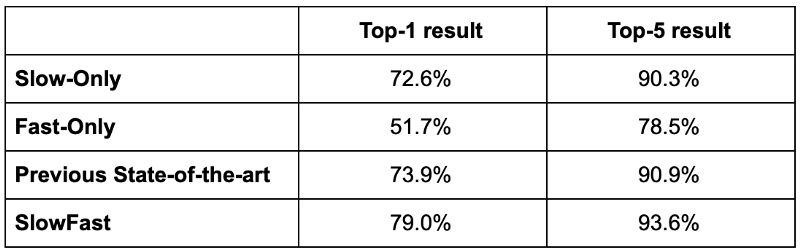 有趣的是,论文比较了只使用Slow通道、只使用Fast通道、同时使用Slow和Fast通道的结果,在Kinetics-400上,只使用Slow通道的网络其top-1结果为72.6%,top-5为90.3%。只使用Fast通道的网络,top-1和top-5分别为51.7% 和 78.5%。