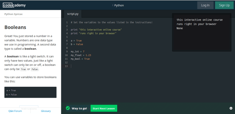 你可以使用这个免费的、基于web的平台教孩子学习编程。它讲授多种开发语言的实际语法,并提供实战练习的机会,只有当你输入正确的代码后,才可以进入下一等级。