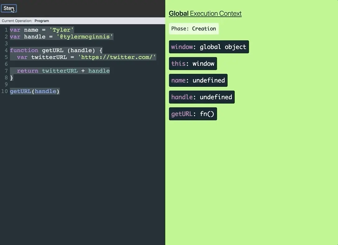 这里有几处重要细节需要注意。首先,传入函数的所有参数都作为局部变量存在于该函数的执行上下文中。在例子中,handle同时存在与全局执行上下文和getURL执行上下文中,因为我们把它传入了getURL函数做为参数。其次,在函数中声明的变量存在于函数的执行上下文中。