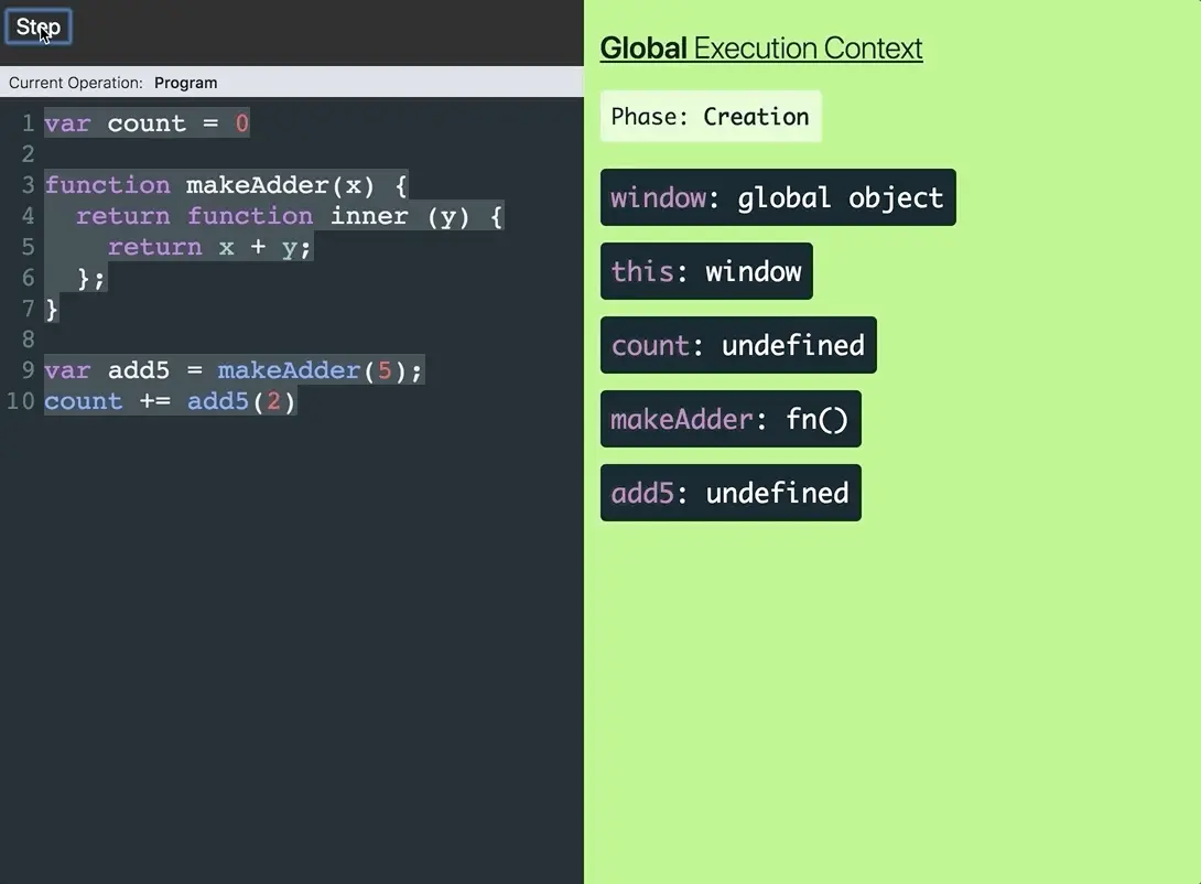 makeAdder执行上下文从调用栈弹出后,Javascript Visualizer创建了一个Closure Scope(闭包作用域)。Closure Scope中的变量环境和makeAdder执行上下文中的变量环境相同。这是因为我们在函数中嵌入了另一个函数。在本例中,inner函数嵌在makeAdder中,所以inner在makeAdder变量环境的基础上创建了一个闭包。因为闭包作用域的存在,即使makeAdder已经从调用栈弹出了,inner仍然能够访问到x变量(通过作用域链)。
