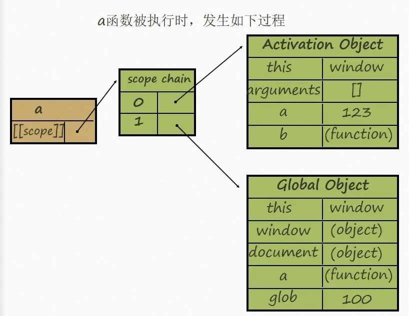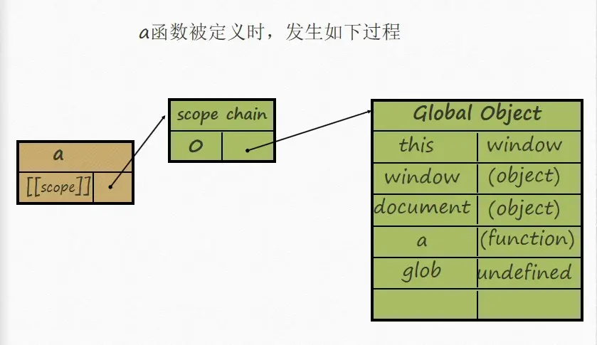 a();第二步:a执行,生成了自己的AO,插入到了[[scopes]] 0 位GO 往后延