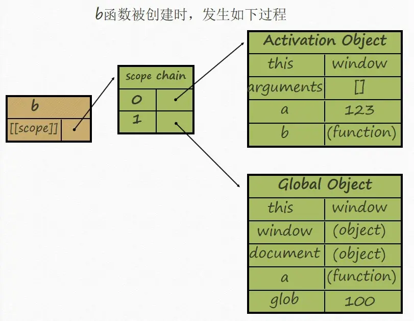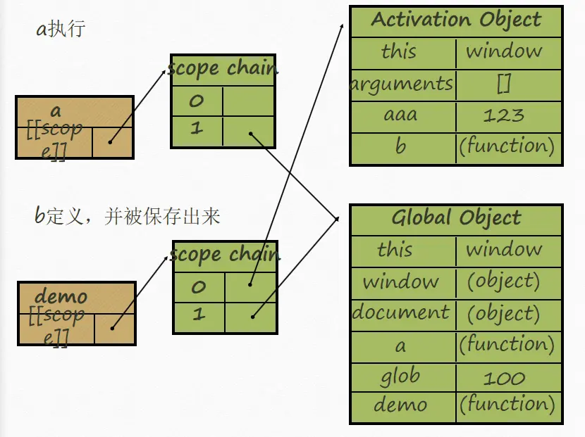 第三步:a执行引起的b的定义,这个时候b继承了a的劳动成果,直接把a的生成的作用域链的引用拿来挂到自己的身上。这个时候 b.scope[0] 指向的AO和 a.scope[0] 指向的AO是同一个。(结合一下自己写代码就能知道,在子函数里面改变了外部函数的值,外部函数的值也改变了)