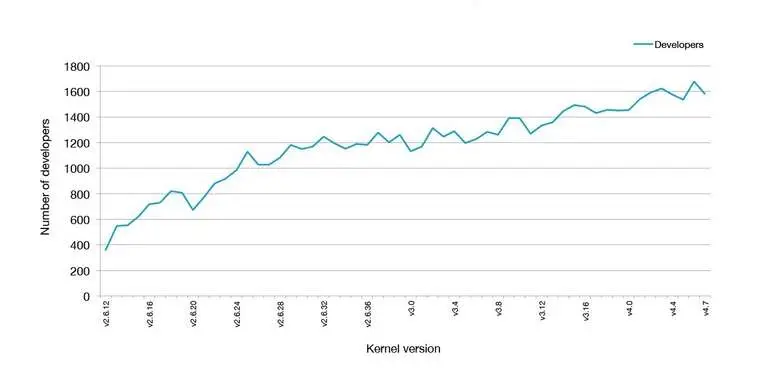 很多公司都在商业上依赖开源软件,而且还获得了很大的成功,所以他们也懂得和明白为开源软件项目做贡献。我们来看一组数据,从2005年,截止到现在,单单Linux内核一个项目,就有来自1300个不同的企业的13500位开发者参与了贡献。