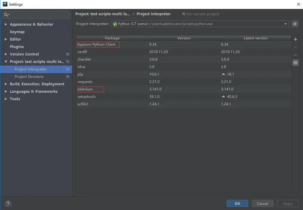 运行Pycharm安装或使用pip命令安装在代码编写过程中使用到的库,诸如selenium和Appium-Python-Client