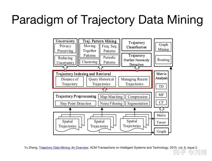 首先介绍轨迹数据挖掘的范式,即下图。最下面是Spatial Trajectories,即地理轨迹数据,主要通过GPS、智能设备、wifi等前端设备收集。接着向上经过Trajectory Preprocessing,即轨迹预处理,这部分内容主要包括轨迹数据的压缩和去噪,读者可以看这篇文章。经过预处理后,轨迹数据即可导入数据库,数据库涉及到如何对数据进行索引和检索,也就是说本文要介绍的内容。再向上即涉及到轨迹数据挖掘的应用,例如轨迹不确定性消除、轨迹模式挖掘、轨迹分类、轨迹异常值检测等等。