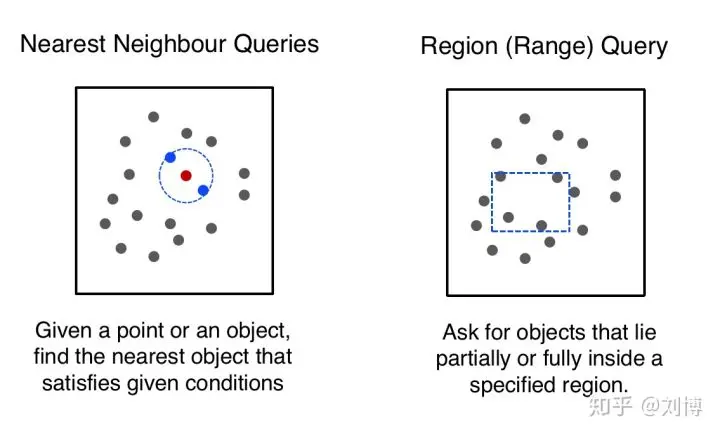 传统的数据库查询有两种基本类型,即“最近邻查询”和“范围查询”。 - “最近邻查询”就是给定一个点或者一个目标,找到满足给定条件的最近目标。 - “范围查询”就是给定一个地理区域,查询部分或全部位于该范围内的目标。