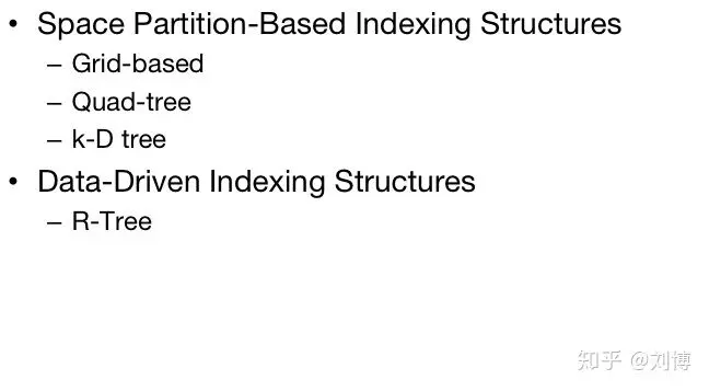 按照分类标准的不同,地理数据索引的数据结构可以分为两大类。 - “基于空间划分的索引结构” - 基于网格的 - 四象限树 - K维树 - “数据驱动的索引结构” - R树