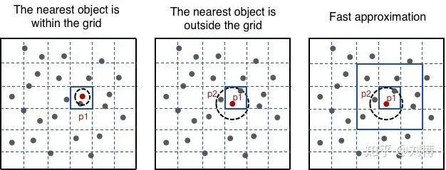 如何进行“最近邻查询”,测距标准可以选用欧式距离,当然,欧式距离与现实中的真实距离非常不同。查询时有两种情况,一种情况是最近的点与目标点在同一个网格内,另一种情况就是不在同一个网格内,所以可以采用快速的估计方法,即把目标点周围的网格(必须能够包含查询范围)都作为候选网格,在候选网格中找最近点。
