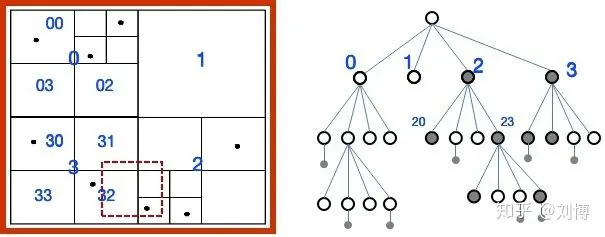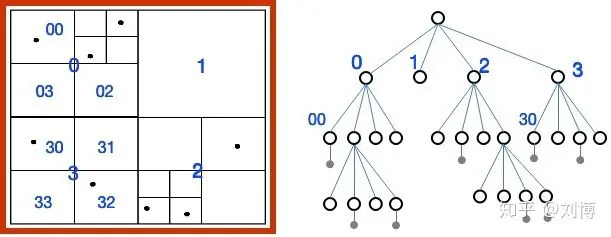 如何建立索引? - 四象限树种的每一个节点都是一个地理为重空间中的一个长方形区域;根节点代表整个空间 - 每一个非叶节点将空间划分为4个大小相等的空间 - 每一个叶节点包含0到一个固定数字数量的点。图中这个固定数字是1。