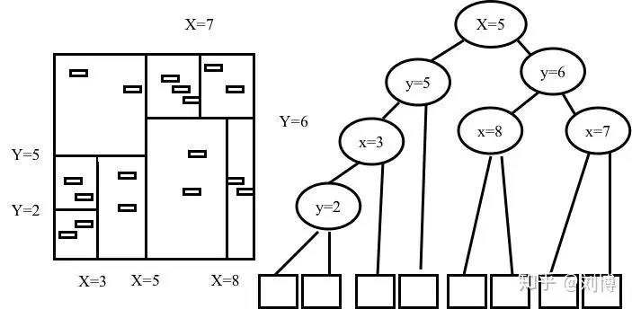 以下图举例,如果我想找到左上角的两个点,首先,从根节点出发(X=5),这两个点在X<5的方向,这个方向即Y=5,接着向Y>5的方向走,这个方向得到两个叶节点,即我们想要的点。这两个点所在的区域除了外框,有两条边,所以这两个点在树结构的第二层级(根节点为0层级)。