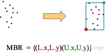 R树的基本单元:最小外接矩形(MBR,Minimum Bounding Rectangle),简单说就是能把左边这些点都包含起来的最小的矩形。通常我们使用两个点来代表该矩形,即左下和右上的两个点。