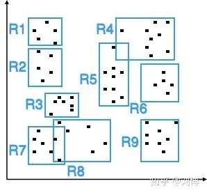 我们可以把聚集的数据点都用MBR包含起来,这里MBR可以重叠(数据不能重叠),还可以进一步将多个MBR再组合为更大的MBR。