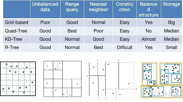 最后从对不平衡数据的处理、范围查询、最近邻查询、构建、结构平衡性、存储要求方面比较上述算法。表中结论R-tree是相对较好的数据结构。
