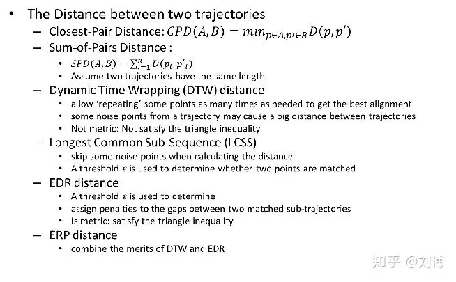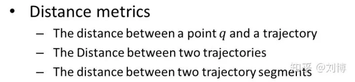 按照测距的对象不同,距离度量可以分为3类: - 一个点q和一条轨迹之间的距离 - 两条轨迹之间的距离 - 两条轨迹段之间的距离