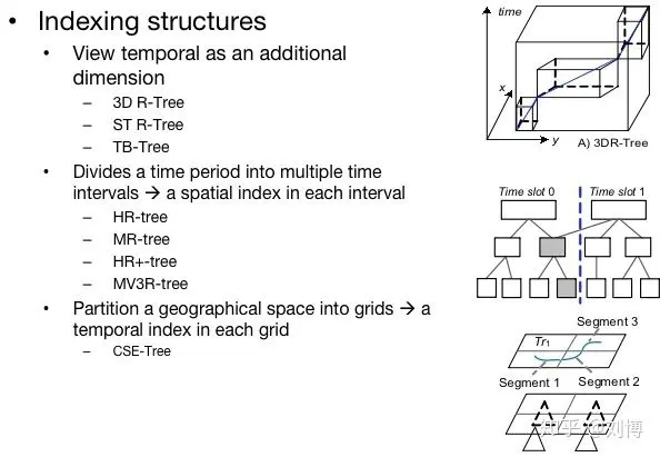 为了满足检索的需求,前面已经介绍了传统的数据结构可以实现区域检索,但是如果我们想对某段时间的轨迹进行检索,如何设计数据结构? 轨迹数据结构按照可以分为3类,第一类是将时间看成一个单独的维度,经典算法有3DR-Tree,STR-Tree,TB-Tree。第二类是将时间切割为时间段,每个时间段有一个单独的R-Tree,不同时间段的R-Tree之间如果有重复的数据,则直接指向之前的R-Tree。第三类算法是将轨迹数据切分后放在不同的网格中,每个网格中有一个时间索引。