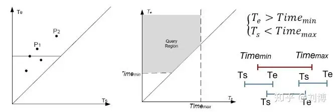 如果我们将横坐标设为开始时间,纵坐标设为结束时间,那么我们可以将所有网格P画在一个平面上,且这些网格都落在45度线上面,因为结束时间一定大于开始时间。 一个基于时间的查询,就是坐标中的灰色区域。只有开始时间大于查询的最小时间,结束时间小于查询的最大时间的区域才符合查询要求。