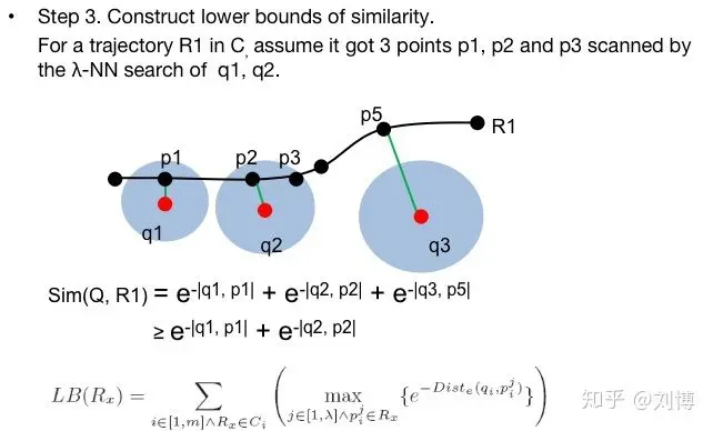 相似性函数Sim(Q,R) 第一步,先找到轨迹R中与给定点最近的点 第二步,利用相似性度量,计算距离。