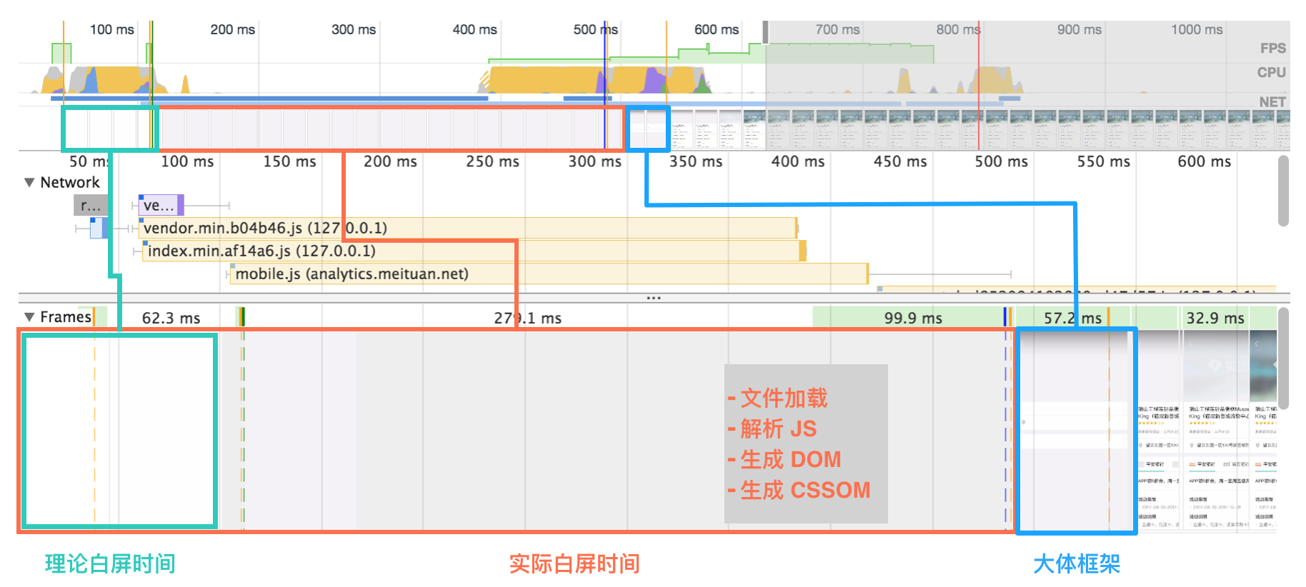 要搞清楚为什么会有白屏,就需要利用这个理论基础来对实际项目进行具体分析。通过 DevTools 进行分析: